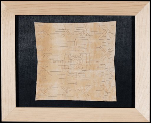 Framed square birchbark biting design of a large floral flanked by many dragonflies. Made by Denise Lajimodiere, Turtle Mountain Ojibwe, in 2015-16 during her time as a Minnesota Historical Society Native American Artist-in-Residence. 2016.108.7 (Accession Number)