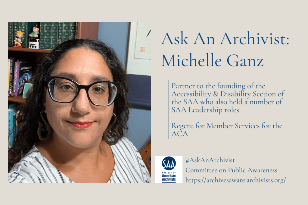 For our third installment of this mini-series, we’re excited to share a conversation with Michelle Ganz, partner to the founding of the Accessibility & Disability Section of SAA and Regent for Member Services for the Academy of Certified Archivists (ACA). Rachael Cristine Woody of the Committee on Public Awareness sat down with Ganz (virtually) for a video conversation on June 23, 2021.