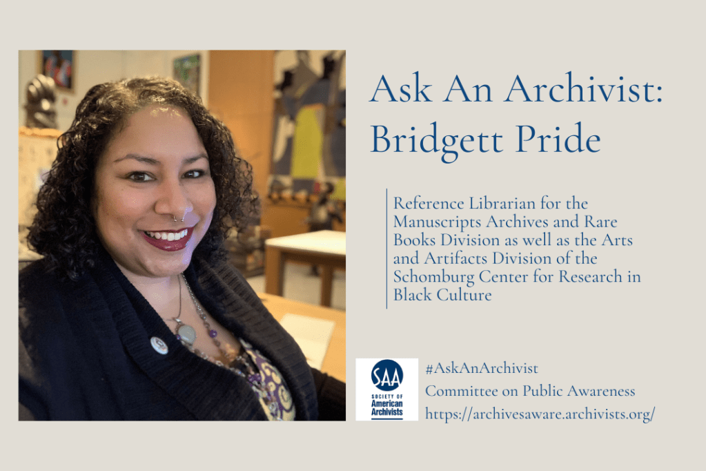 For 2021 #AskAnArchivistDay and our fist installment of this mini-series, we’re excited to share an interview with Bridgett Pride, Reference Librarian for the Manuscripts Archives and Rare Books Division as well as the Arts and Artifacts Division of the Schomburg Center for Research in Black Culture. Rachael Cristine Woody of the Committee on Public Awareness sat down with Pride (virtually) for a video interview on Friday, June 25, 2021 to talk about becoming an archivist, the stereotype of archivists as gatekeepers, and more.