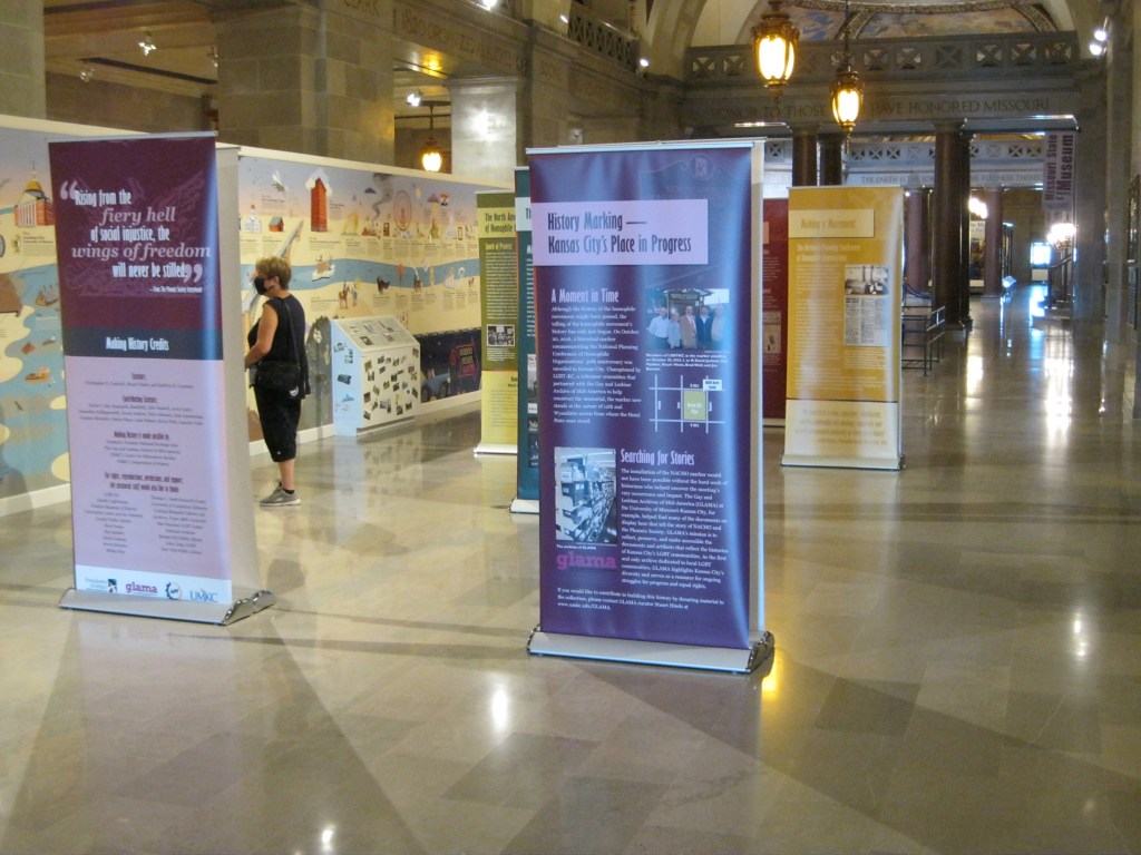 We were able to convince them to be strident and move forward and they agreed, and we got the funding to do it.. The touring version of the exhibit has traveled across Missouri and across Kansas to several different places: to a small-town public library in southeast Kansas where there is a very active queer community, to public libraries here in the metropolitan area, and to museums and historical societies. There was never an issue in the eight or nine places it’s been. Then I was working with folks who are affiliated with the Missouri State Museum, which is in the state capitol in Jefferson City. We were having conversations about queer Missourians in advance of the state’s Bicentennial which is this year, as they were trying to do an exhibit on important Missourians in the history of the state, and they reached out and we talked about some of the the activists here in Kansas City. As part of that conversation, I mentioned this touring exhibit. They were excited about that, and reached out earlier this spring when we made the final arrangements to get the exhibit to them. It went up in what they call the History Hall, which is the hallway outside of the museum, inside the Missouri State Capitol. Some legislative aides, and a legislator reached out to the Museum and asked why this exhibit was on display. They got a very appropriate response from the Director of the Museum, and then they took it further. They took it to the leadership of the department that oversees the museum, which is the Department of Natural Resources.. The leadership of the Department of Natural Resources, four days after the exhibit went on display, decided to remove it from the state capitol. There was a big hue and cry that got a lot of media attention, locally, regionally, nationally, and internationally. It was in the New York Times, it was in the Washington Post, it was in The Advocate, it was an all sorts of queer blogs. You really couldn’t escape it. As a result of the outcry, the Department of Natural Resources relocated the exhibit in one of their buildings, also located there in Jefferson City, a historic building about four blocks away from the state capitol, far less visible and far less accessible. That’s where the exhibit remains to this day, even though most of the national, regional, and local professional history organizations issued public letters to the governor demanding that the exhibit be relocated back to the state capitol, which didn’t happen and won’t happen at this point. So that’s been challenging on many different levels.It’s just interesting that we encountered this pushback in a building that is supposed to be for all Missouri citizens. First, that they would censor student work and second, that they would censor a specific community of Missourians is really disheartening and frustrating.