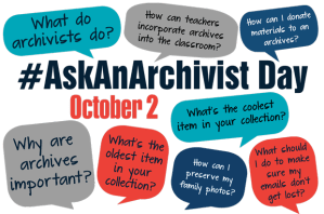 Graphic: In voice bubbles in different colors (aqua, gray, dark blue, red) questions surround text #AskAnArchivist Day October 13: What do archivists do? How can teachers incorporate archives into the classroom? How can I donate materials to an archives? Why are archives important? What's the oldest item in your collection? How can I preserve my family photos? What should I do to make sure my emails don't get lost?